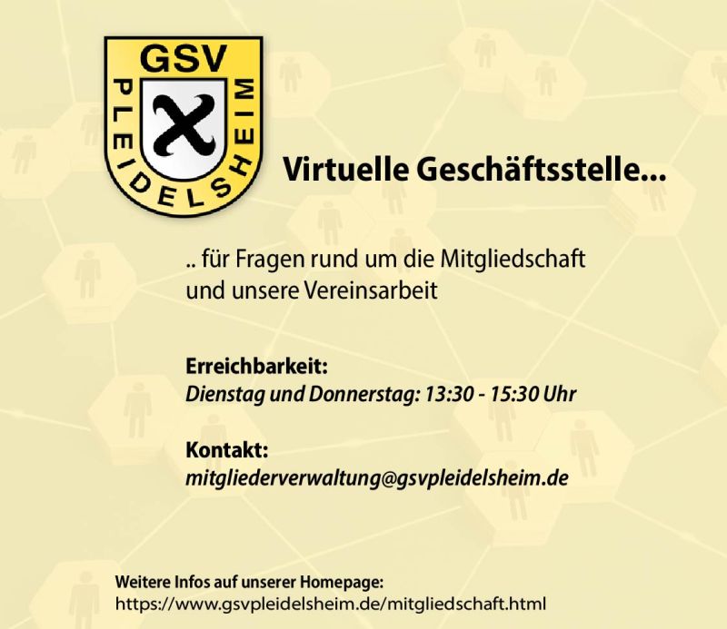 Kontakt:Mobil: 0176 75488232E-Mail: mitgliederverwaltung@gsvpleidelsheim.de