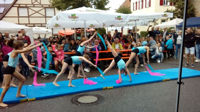 Leider machte uns der Regen ein Strich durch die Rechnung, denn die geplante Airtrackaufführung, bei der die Liga- Nachwuchsturnerinnen ihr Können zeigen wollten, konnte wegen Verletzungsgefahr nicht gezeigt werden. Doch die Mädels wollten trotzdem unbedingt etwas Vorturnen und so überlegten wir uns kurzfristig eine neue Aufführung, die nur mit ein paar Bodenmatten stattfand und vorher nie geprobt wurde. Es konnten aber trotzdem Räder, Bogengänge und sogar Flick-Flacks bestaunt werden. Danke an alle helfende Hände, die kurzfristig parat standen um die Matten zu trocknen und somit erst das Turnen möglich machte!