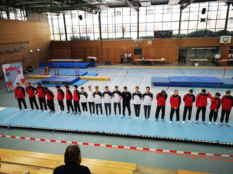 Durch den parallel durchgeführten Oberliga Wettkampf in der Halle, starteten wir wie nicht wie üblich, in Olympischer Reihenfolge am Boden, sondern am vierten Gerät, dem Sprung. Hier erturnte Jonas Zimmerman mit 10,65 die höchste Punktzahl für das Turn Team MEP vor Julian Rentschler mit 10,30 Punkten und Pascal Neuweiler mit 10,15 Punkten. Der MTV Ludwigsburg erreichte mit der höchsten Übung sogar 12,45 Punkte und gewann das Gerät souverän mit 44,45 zu 40,70 Punkten.
