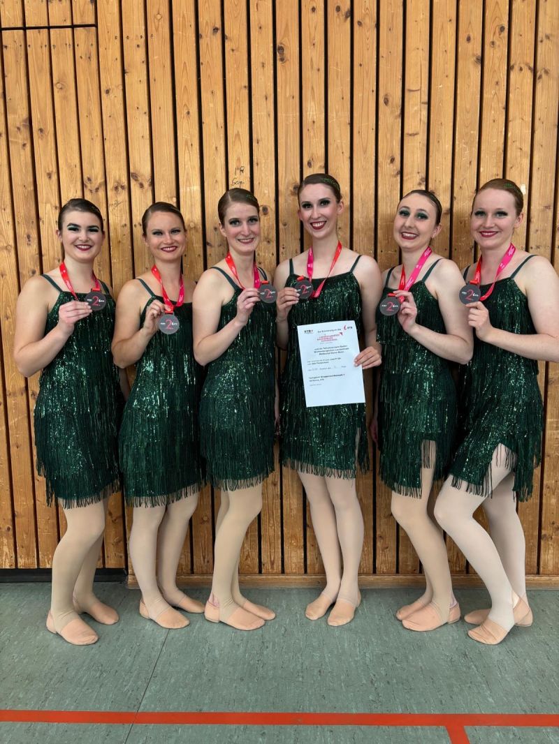 Auch JustP hatte am Donnerstag ihren Landeswettkampf Dance Basic, der etwas außerhalb in Baienfurth stattfand. Da 3 der Tänzerinnen ebenfalls beim Turnen dabei waren, trennte sich JustP kurzzeitig und Anna, Helena und Betty machten sich schon mal auf den Weg nach Baienfurth und Lisa, Emma und Giulia gingen mit den anderen Turner:innen weiter zum Rope Skipping und 100 m Sprint. Kurz vor 15:00 Uhr waren dann auch die anderen 3 da und mussten nun schnell aus dem Turnanzug raus und rein ins Tanzkostüm. Etwas stressig, aber das haben sie super gemeistert! Besonders toll war auch, dass die anderen Turner:innen zum Tanzwettkampf mitkamen, um JustP anzufeuern! Der Pleidelsheim Fanclub wurde noch ergänzt mit weiteren Pleidelsheimern und es wurde sogar die GSV Pleidelsheim Fahne gehisst. Trotz rutschigem Boden und ein paar Wacklern, wie bspw. die Steckenbleiberin bei der Hebefigur, konnte JustP das Kampfgericht überzeugen und belegte mit 12,90 Punkten den 2. Platz! Gleich anschließend ging es weiter ans Turnen, es fehlten noch die Geräte Sprung, Trampolin und Schwimmen. Emma und Giulia mussten sich dafür nochmals in ihre Turnanzüge werfen. Lisa hatte es tatsächlich geschafft bereits alle ihre Geräte vor dem Tanzwettkampf abzuschließen, womit das JustP Trainer Team wieder vollständig war und sich schon mal auf den Weg zur Schule machte. In der Zwischenzeit waren auch noch weitere 9 Turnerinnen angereist, die am Samstag ihren Wettkampf gehabt hätten.