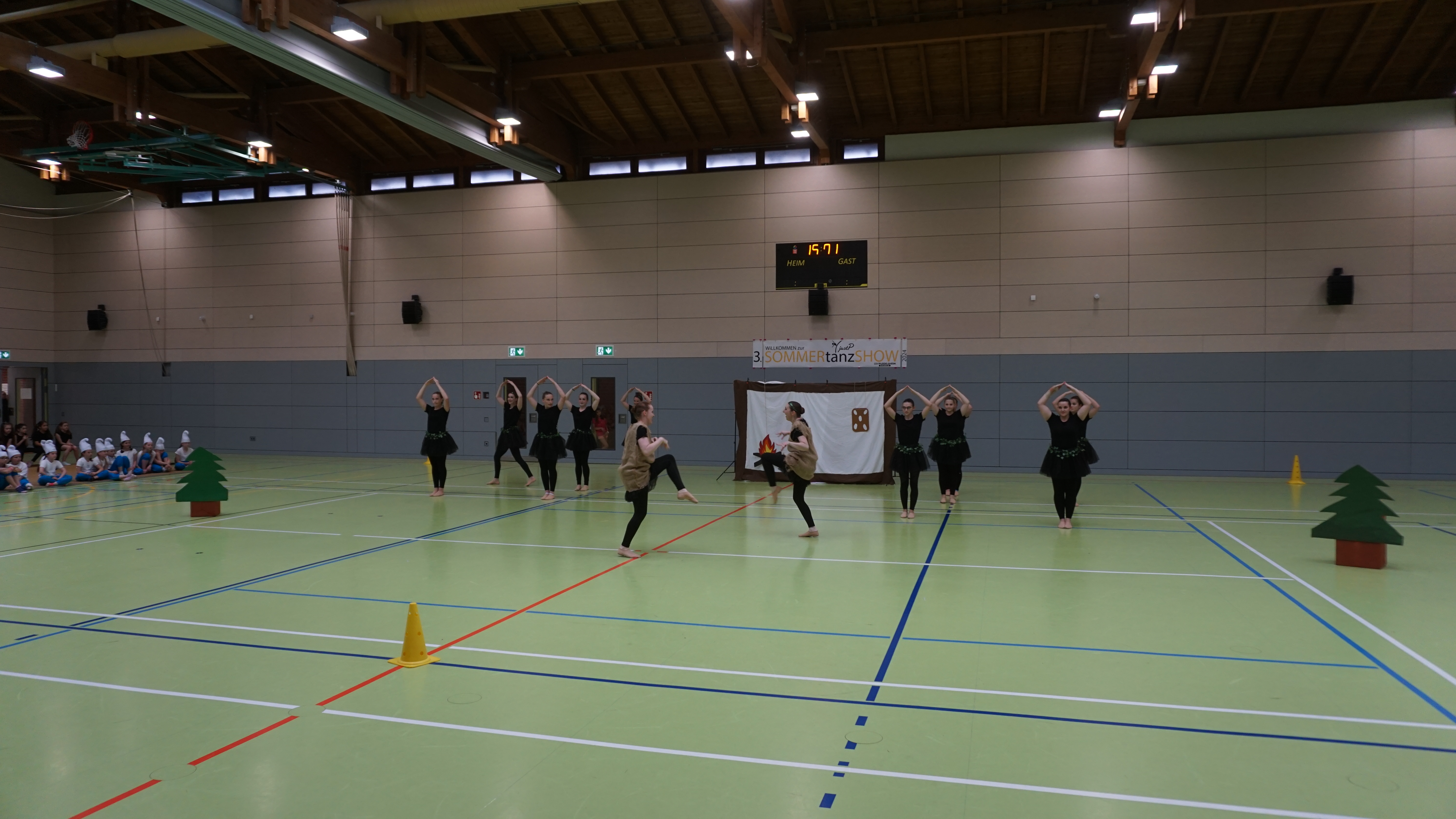 Um 15.30 ging es für die rund 120 Tänzerinnen aus neun Gruppen mit einem gemeinsamen Einmarsch los. Davor war hinter den Kulissen schon einiges los. Die verschiedenen Gruppen wurden kostümiert, Frisuren wurden gemacht, Kinder geschminkt und letzte Dinge nochmal besprochen…. Dann war es so weit. Mit lautem Applaus und schwungvoller Musik konnten alle Tänzerinnen auf die Fläche. Nach einer kurzen Begrüßung und Vorstellung aller Gruppen ging es dann endlich los.